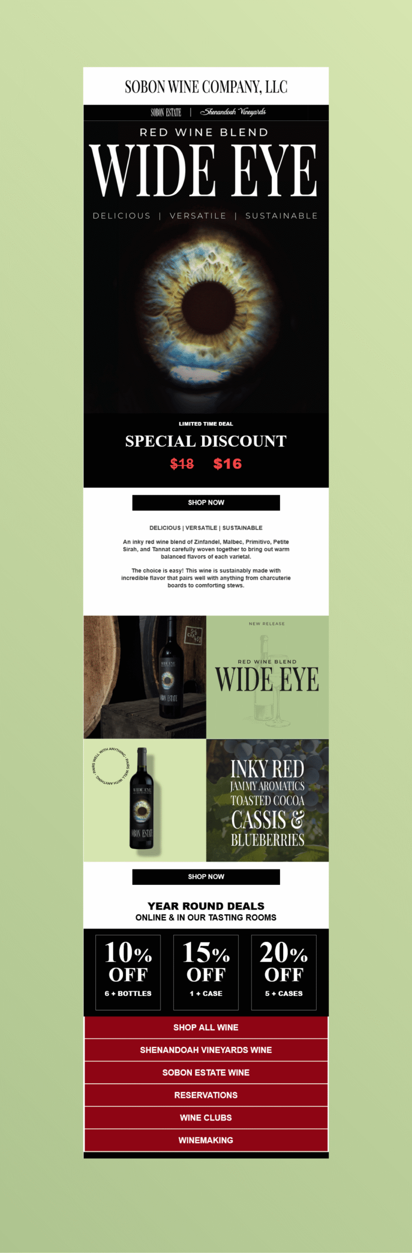 Sobon Wine Company is a family owned and operated winery in the Sierra Foothills of California that has been making wine since 1977. One of their many new releases was a special red blend with a unique label design. I created this coordinated wine release campaign with banners, email graphics, social media posts, and social media stories to boost sales and kick off the release of a new exciting red blend. I did research on use trends and how customers interact with our emails as well as conducted an experiment on the success of a story release with our customers. Although the stories weren’t very popular with their customers, the email portion of the campaign was a huge success accounting for 20% of the sales from that week.